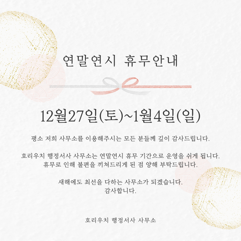 호리우치 행정서사 사무소는 위 기간 동안 연말연시 휴무로 운영을 쉽니다.