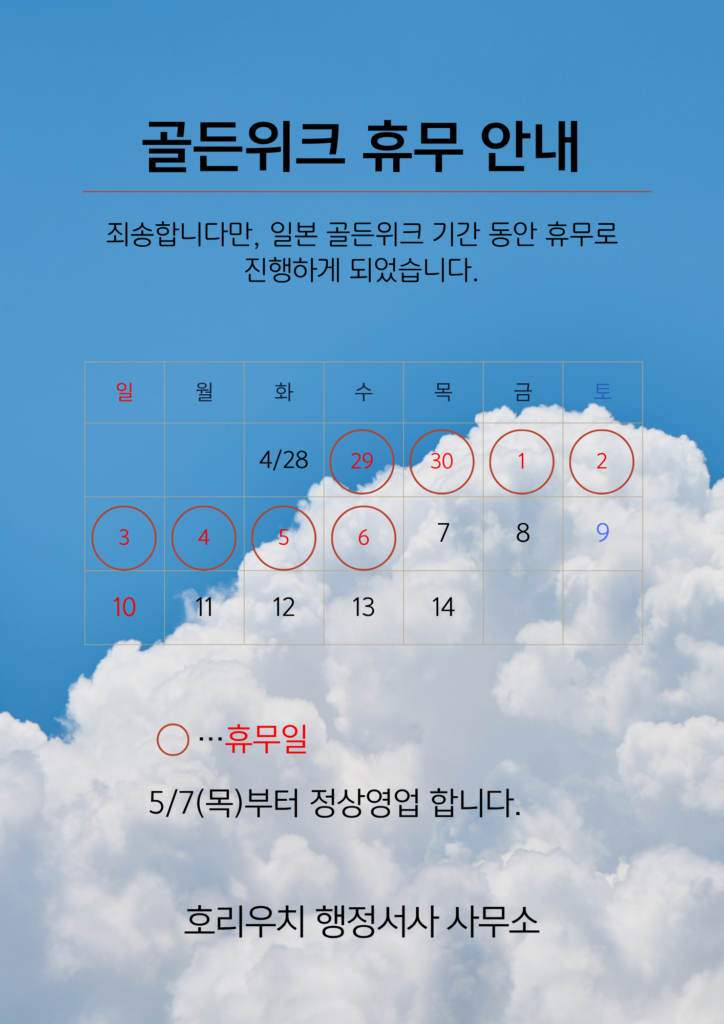 대단히 죄송하지만, 아래 일본 골든위크 기간 동안 휴무로 진행하게 되었습니다.